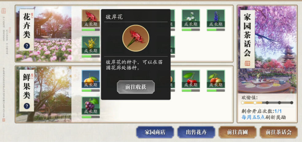 每周可以购买一个彼岸花的种子,每一个差不多能获取40W的碎银。同时每次苗圃成熟采集的时候都有几率获得变化的种子,一周下来种植差不多能获取100W的碎银。