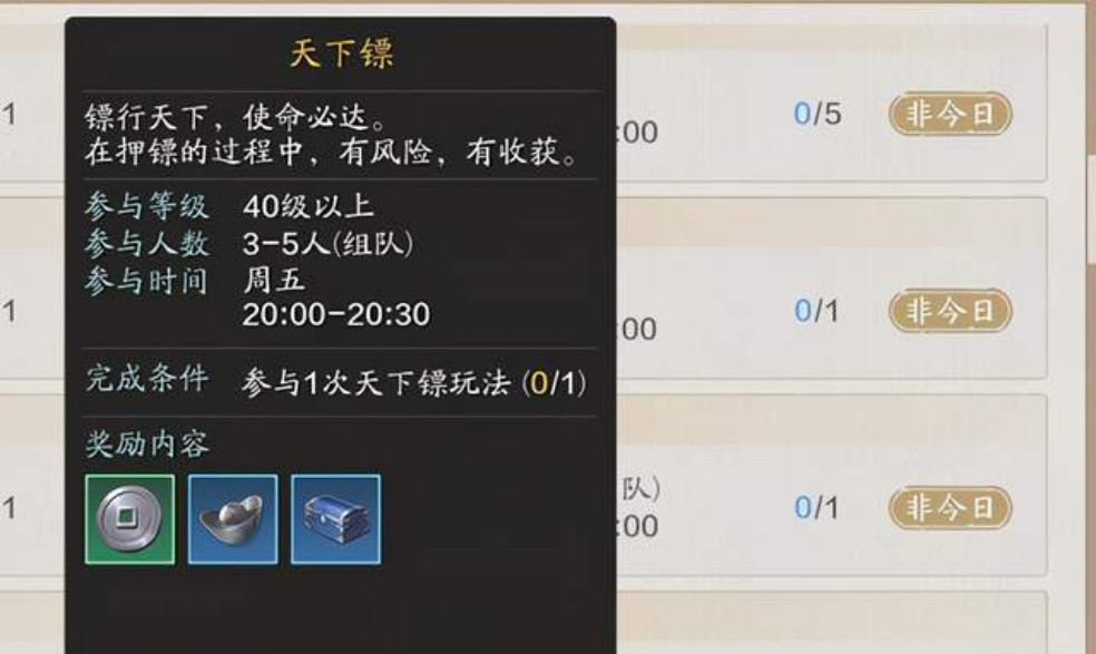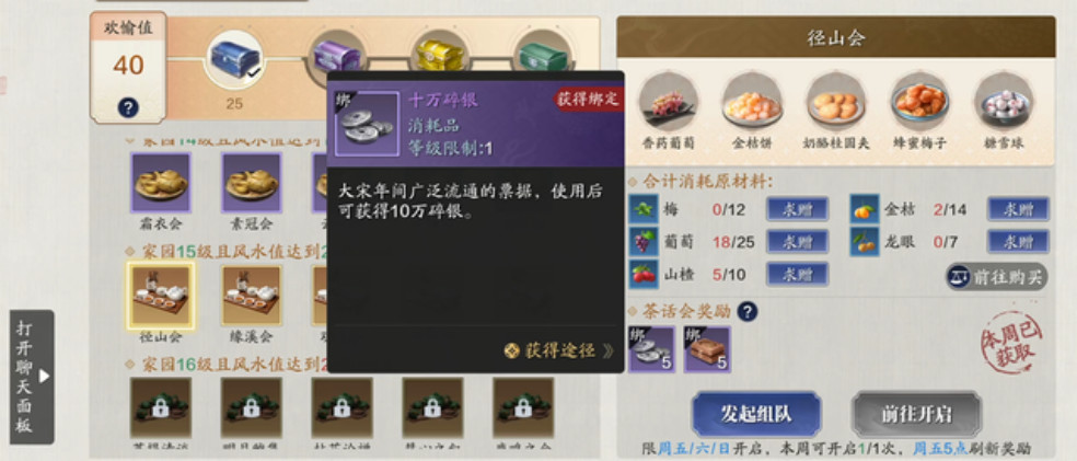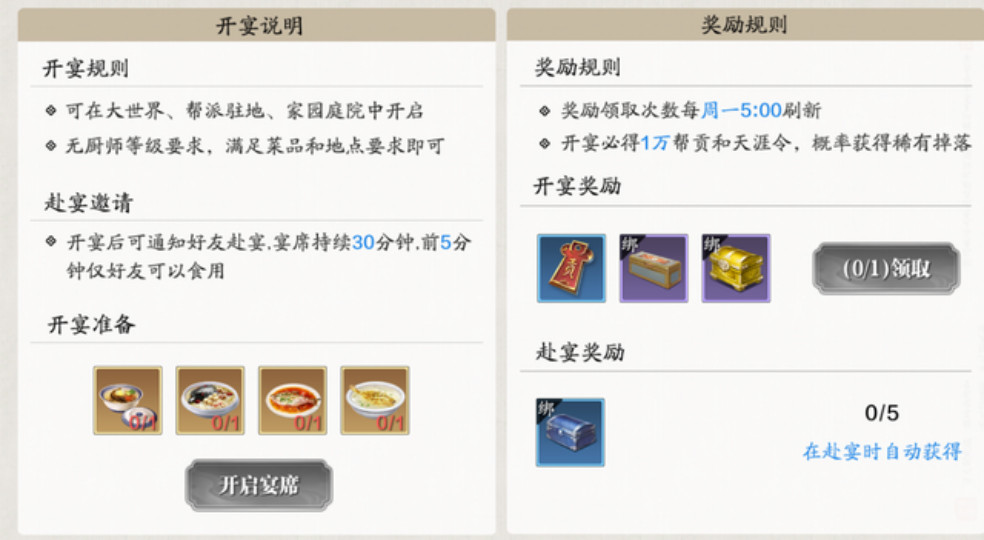 每周可以开启宴席,奖励非常丰厚必得天涯令三,只需要备齐材料,无厨师等级要求。同时每周可以赴宴5次,每次都会有不同数量的碎银奖励。五次下来平均差不多50W碎银。