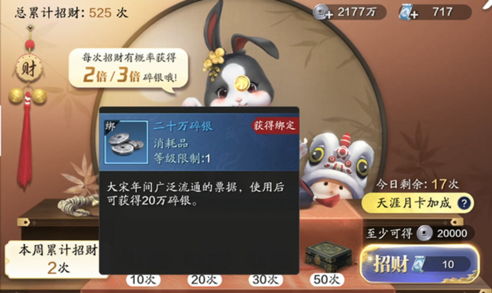 每进行50次招财进宝,再加上50次额外奖励的50W,一周下来近300W碎银。