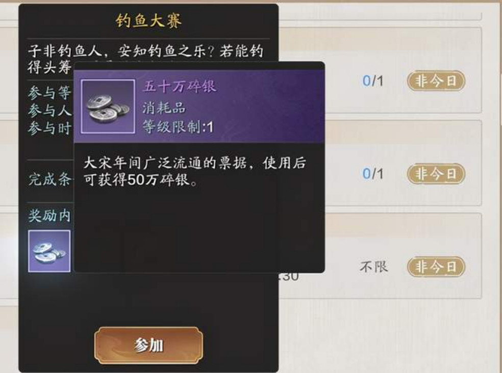 每周开放2次钓鱼大赛,每次奖励50W碎银,共计100W。