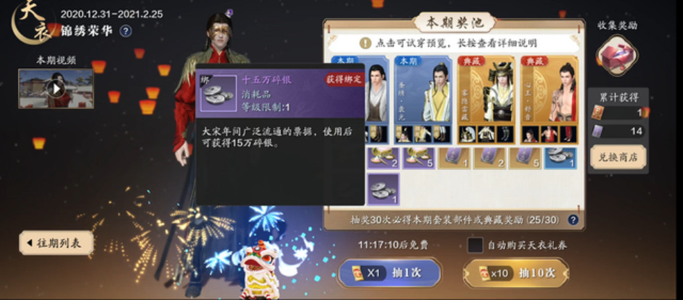 天衣令每周可以进行7次免费抽取,同时商城中每周15个绑点购买的天衣令。建议每周至少进行15抽。性价比非常高。
