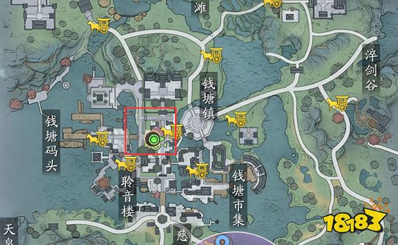 江南(377,516),钱塘镇的左下角,聆音楼右上角。