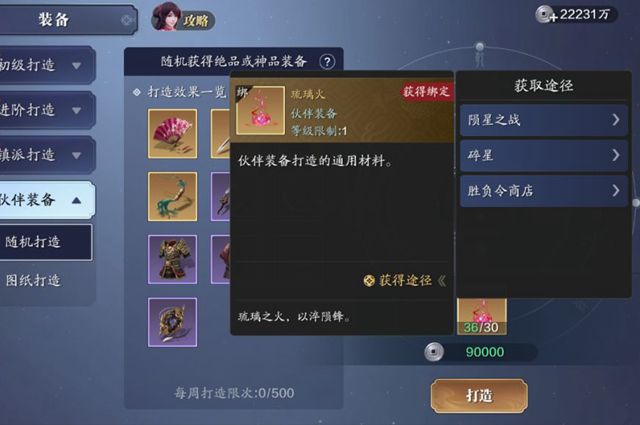 一周获得的琉璃火的数量玩家可以用来打造两次,还需要消耗9w的铜钱。