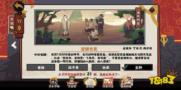 无悔华夏渔樵问答7.22问题:农历7月22日是财神节,古代财神首推范蠡。据说名臣范蠡辅助越王勾践灭吴后,认定“狡兔死,走狗烹;飞鸟尽,良弓藏”,于是化名陶朱公,邀请挚友功成身退一同行商,却遭到此人婉拒,此人便是?正确答案是文种。
