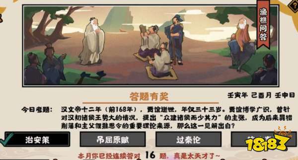 无悔华夏渔樵问答活动9.16问题:汉文帝十二年(前168年),贾谊逝世,年仅三十三步。贾谊博学广识。曾针对汉初诸侯王势大的情况,提出“众建诸候而少其力”的主张,成为后来晁错削藩和主父偃推恩令的重要理论来源,那么这一见解出自?正确答案为A、治安策。