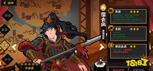 无悔华夏霍去病作为一个天级角色,霍去病的整体强度是非常可观的,战斗能力也非常强势;霍去病技能乘胜-2分钟内战斗力提升25.战斗力提升10%。