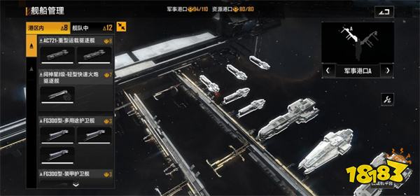 进入军事港口就可以看到停泊的军事战舰,停泊在港口的,都是还没有被编入舰队的战舰,可以点击快捷编组,选择你想要编入队伍的战舰,进行精准的编队。也可以直接全部选择,把港口停泊的战舰直接全部快速的编队。前者胜在更具有针对性,可以进行更合理的战舰构成,后者胜在方便快捷,用于执行较为轻松的计划。