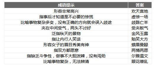 欢天喜地 虚惊一场 歧路亡羊 受夹板气 金风玉露 贻笑大方 蛾眉曼睩 两情两愿 尔雅温文 眼花缭乱