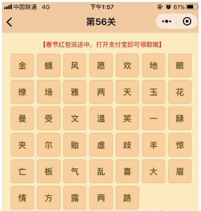 微信成语消消乐翻天是一个微信小程序游戏,属于猜成语类型的小游戏,游戏趣味性很强,但其中有些关卡的难度较高,下面小编就给大家带来了第56关的通关答案,希望对各位能有所帮助。