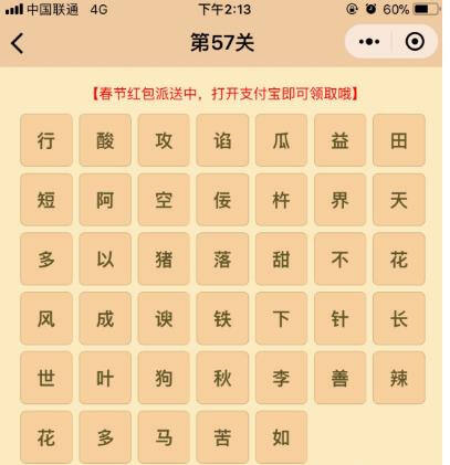 微信成语消消乐翻天是一个微信小程序游戏,属于猜成语类型的小游戏,游戏趣味性很强,但其中有些关卡的难度较高,下面小编就给大家带来了第57关的通关答案,希望对各位能有所帮助。