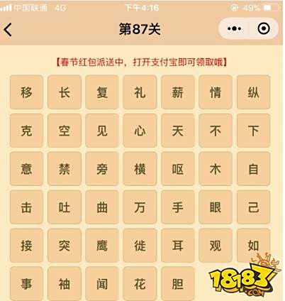 微信成语消消乐翻天是一个微信小程序游戏,属于猜成语类型的小游戏,游戏趣味性很强,但其中有些关卡的难度较高,下面小编就给大家带来了第87关的通关答案,希望对各位能有所帮助。