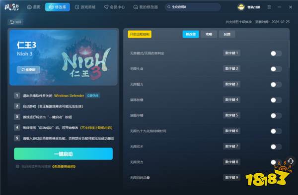 在Team NINJA打造的《仁王3》中,玩家将投身于一个更加宏大且残酷的战国乱世。本作不仅继承了系列标志性的硬核动作系统与深邃的妖怪文化,更引入了开放世界探索与双流派(武士/忍者)战斗机制。然而,随之而来的是令人闻风丧胆的高难度Boss战、复杂的装备词条构建以及漫长的“刷宝”过程。对于渴望掌控战场、或是希望专注于剧情体验的玩家而言,由“风灵月影”团队打造的五十项修改器,便如同游戏中最强力的“神之恩宠”,赋予了你斩断一切苦难、改写生死规则的神力。