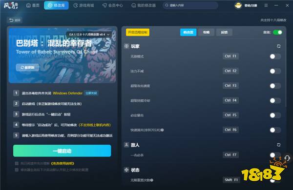 下载:前往风灵月影官网、3DM、游侠网等可信站点,搜索“巴别塔混乱的幸存者”,下载对应游戏版本的“十八项修改器”。务必核对游戏版本号(如 v1.0.5, v1.1.0 等),版本不匹配会导致功能失效或崩溃。