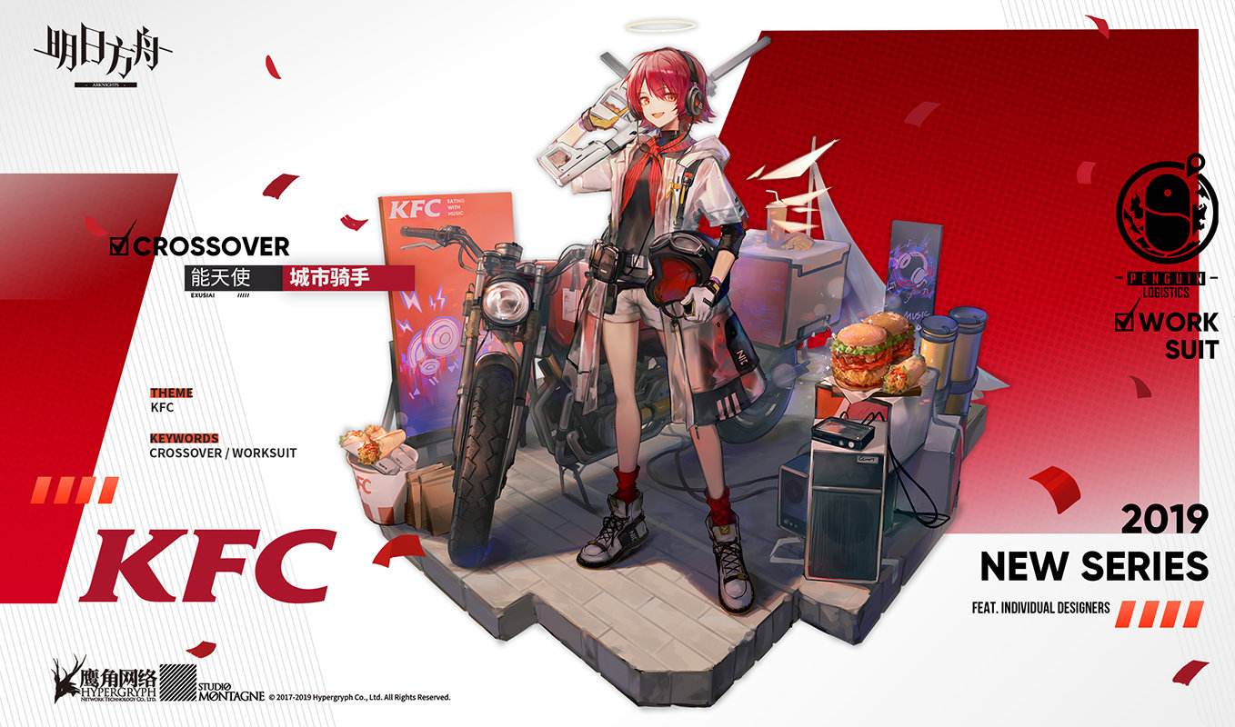活动说明:活动期间内于KFC口袋炸鸡店购入明日方舟联名套餐,获得指定角色时装【KFC合作系列-清晨七点】。