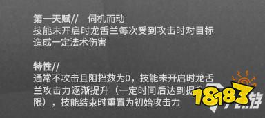 天赋特长决定了龙舌兰是一个完全依赖技能的干员,没释放技能的时候就不会攻击,期间除了收到伤害会对目标造成一定法术伤害之外,攻击力也会不断的上升直到达到一个上限,储存的攻击力会用于下一个技能,而后恢复到初始的攻击力重新开始积蓄。