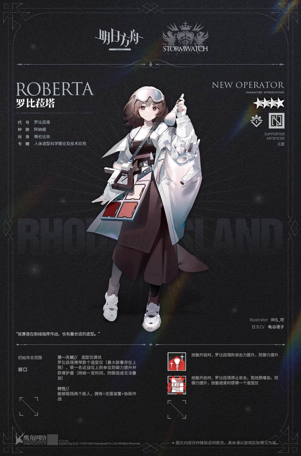 化妆师罗比菈塔,多年来在哥伦比亚蓝卡坞打拼,参与影片曾六次获得学院奖最佳化妆与发型设计提名。她在哥伦比亚提卡伦多城偶遇我们的外勤小队,之后便主动要求加入罗德岛,通过考核后,成为一名工程干员。