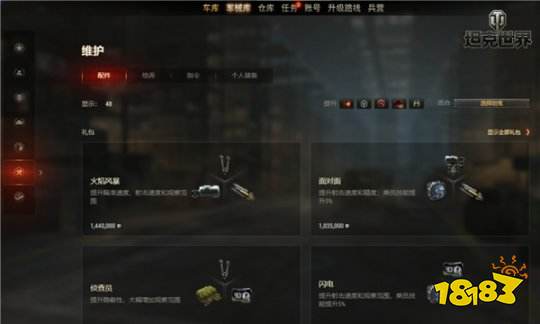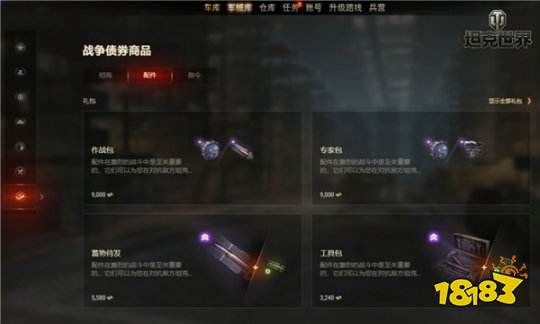 而配件、给养、个人储备、指令全都放入了“维护”分类中。您可以在各个分页之间切换来找到自己想要购买的物品。如果您需要为某台特定坦克添置物品,您也可以激活右上处的筛选器并选择对应坦克。此外,战争债券商品现在被单独放入一个分类中,您可以在此查看改进型配件和指令。