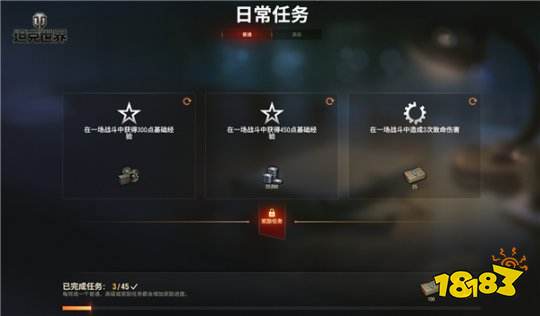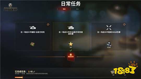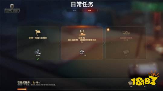 指挥官们可前往车库中的日常任务页查看三个战斗任务的目标和完成情况。这些任务共分为I级、II级和III级,难度依次递增,您可以在任务页查看达成目标的具体条件,并允许在战斗中同时完成这三个任务或累积TA们的进度。