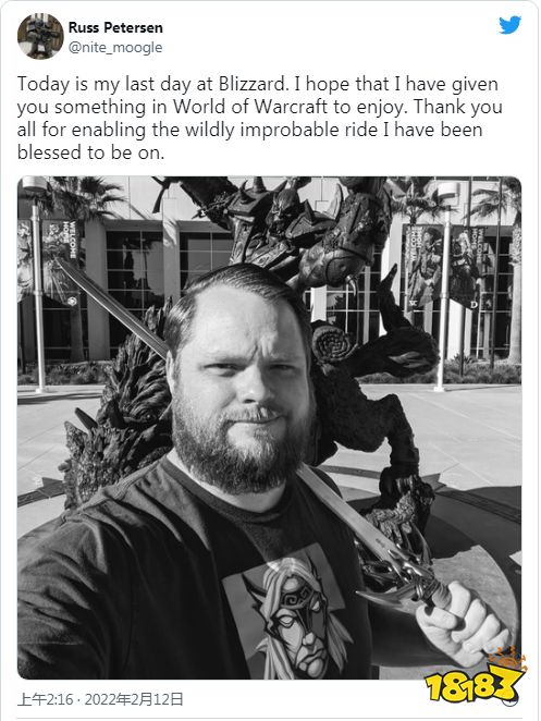 本周五,《魔兽世界》的首席游戏设计师Russ Petersen,也被称为Nite Moogle,宣布他将在暴雪工作最后一天。Russ在暴雪工作了近10年,在推特上,他说:“我希望我在《魔兽世界》中给玩家带来了一些享受。感谢你们让我有幸参与到这难以置信的旅程中。”彼得森没有详细地说明他离开暴雪的原因,也没有提到他下一步计划做什么或可能在哪里。