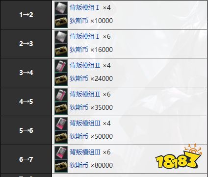 需要材料:背叛模组、狄斯币,每次升级消耗的材料都不同,用户可以提前准备好!