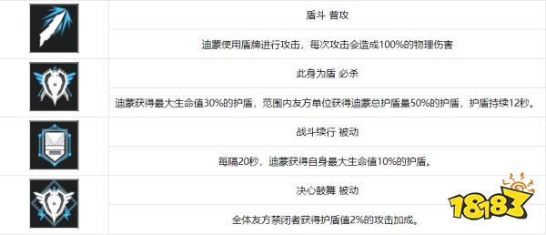 3、基本效果:生命 + 20%;开启后每秒将自身5%的最大生命值转化为护盾。当迪蒙移动后,技能效果消失(每场战斗只能使用一次)。