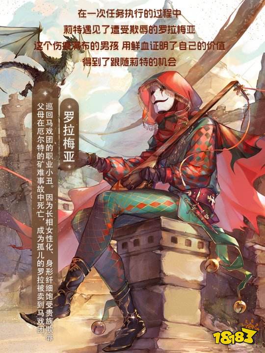 玩家艺人将在剧本中扮演身为厄尔特刺客团成员的莉特,在风云迭起的权力斗争中,莉特雷厉风行的行事态度,吸引了遭受欺辱的马戏团职业小丑“罗拉梅亚”,他用鲜血证明了自己的价值,并跟随莉特出生入死。