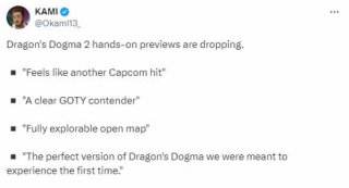 “感觉是卡普空的又一款大热游戏”“明显是年度游戏竞争者”“完全可探索的开放地图”“这是我们首次体验到《龙之信条》的完美版本”。