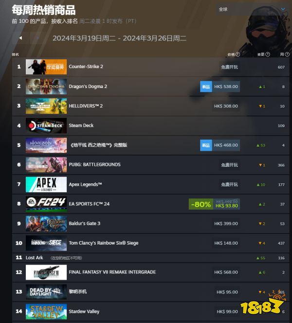 近日,V社公布了全新一期的Steam周销量排行榜(2024年3月19日—2024年3月26日),在排除掉免费游戏以及steamDeck以后,新一周的全球销量冠军被《龙之信条2》稳稳的收入囊中。《地狱潜者2》则屈居第二,本周完整前十名单如下(不包括免费游戏以及硬件设备):