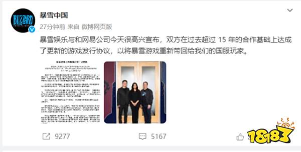 2024年4月10日上午9点整,暴雪娱乐通过其官方微博正式发布公告,宣布与中国合作伙伴网易再度携手,正式回归中国市场。标志着暴雪游戏正式回归中国大陆市场。一石激起千层浪,众多玩家翘首以盼的国服游戏终于有了回归的明确时间表。