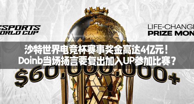 Doinb在和H4cker与Assum一起直播时,听到沙特电竞世界杯赛事奖金的消息,当场扬言要加入UP,去参加沙特杯争夺奖金! H4cker:沙特杯第一名应该去,最后一名也应该去对不对?Doinb:我能去吗?H4cker:你现在立马来UP!Doinb:直接在UP集合吗? 当然这也是在开玩笑,这个比赛不是你想去就能去的只有沙特主办方邀请或者是参加资格赛。