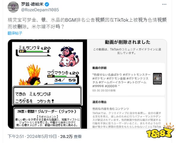 这款视频原本只是简单地展示了《宝可梦》系列中经典的音乐排名,并辅以游戏内的对战场景。然而,令人意想不到的是,TikTok平台竟然以“含有色情内容”为由,对视频进行了下架处理。经过用户仔细比对,官方提供的涉嫌违规画面中,并未发现任何不当内容,仅仅是正常的宝可梦对战场景。
