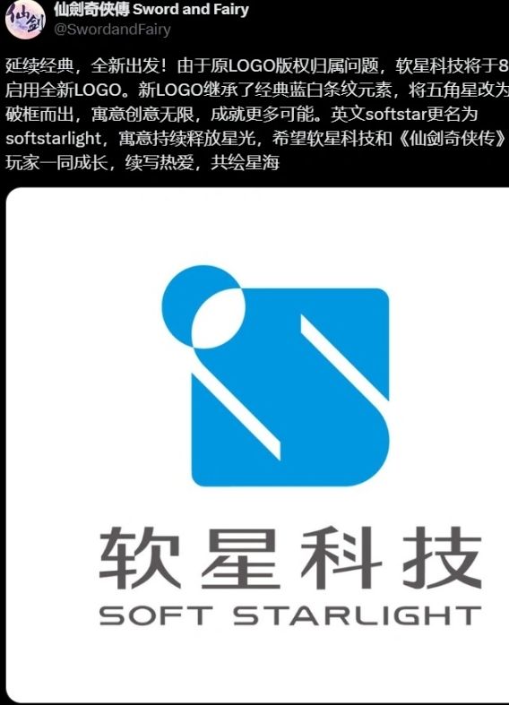 《仙剑奇侠传》官推昨日宣布,由于原 LOGO 版权归属问题,开发商软星科技将于 8 月 12 日启用全新 LOGO。新 LOGO 继承了经典蓝白条纹元素,将五角星改为星球,破框而出,寓意创意无限,成就更多可能。英文 softstar 更名为 softstarlight,寓意持续释放星光。