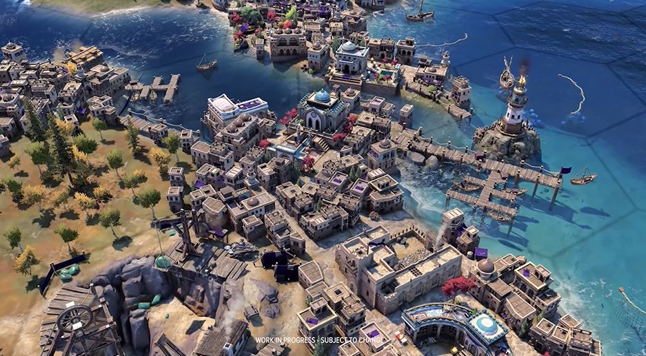后续PV为我们展示了几个不同文明的城市景观,城市几个地块之间会自然形成精细的街道,我记得《文明6》有类似的MOD,开发商应该是把类似想法整合进了游戏。