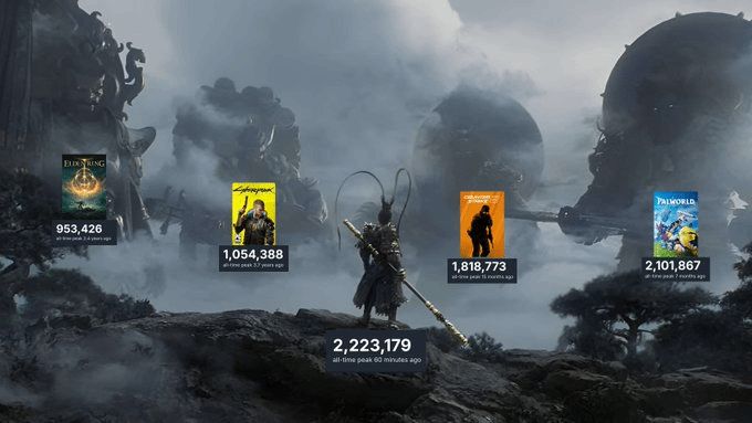 《黑神话:悟空》正式发布后,连续刷新了Steam平台上多项在线玩家记录,成为该平台历史上同时在线玩家数第二高的游戏。一位海外网友分享了一张梗图,图中《黑神话》正挑战《艾尔登法环》、《赛博朋克2077》、《CS2》以及《幻兽帕鲁》这“四大天王”。
