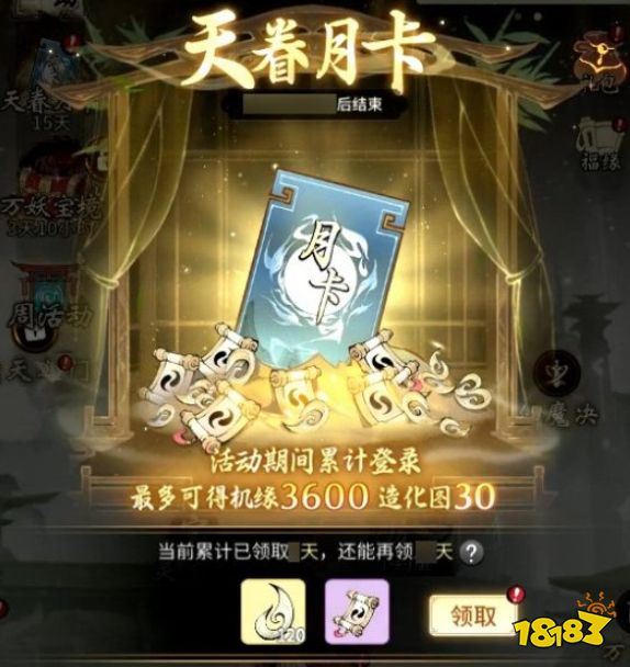 9月30日~11月7日,“天眷月卡”活动开启,全服送月卡,每日登录即可领1张造化图和120机缘,共计可领30张造化图和3600机缘,若气运附体,或能一发抽出至宝。
