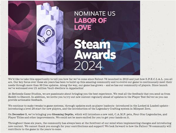 在最近发布的一篇呼吁粉丝为游戏提名Steam爱的付出奖的文章中,B社透露《辐射76》自推出以来玩家数量已超过2100万。B社上一次更新这个数字是在今年6月,当时的数据为2000万,这意味着在不到半年的时间里,《辐射76》又增加100万玩家。
