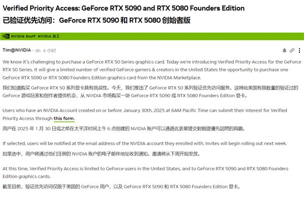 为有效打击黄牛,确保真正的玩家能购得显卡,NVIDIA正式宣布推出“验证优先购买权(Verified Priority Access)”计划。该计划向申请者设置了如下条件:其一,需拥有2025年1月30日之前注册的NVIDIA账户;其二,申请者必须明确要购买RTX 5090还是RTX 5080型号。