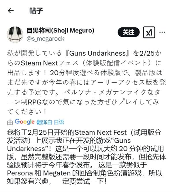 近日,曾担任《女神异闻录》系列和《真·女神转生》系列的作曲家、导演的目黑将司在社交媒体上宣布,其制作的战略JRPG游戏《Guns Undarkness》将于2月25日Steam新品节期间推出试玩版,试玩流程约20分钟。