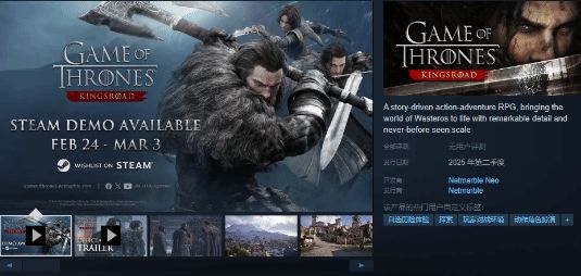 由HBO华纳官方授权,韩国网石公司精心打造的动作冒险RPG游戏《权力的游戏:国王之路》,已亮相本次Steam新品节,并开放了试玩Demo供玩家体验,试玩活动将持续至3月3日。