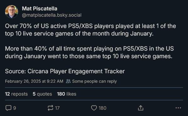 市场分析公司 Circana 分析师 Mat Piscatella 日前在社交媒体上分享称,显示 2025 年1 月美国超过 40% 的 PS5 和 Xbox Series X 玩家游戏时间均花在了排名前 10 名的实时服务游戏游戏上。