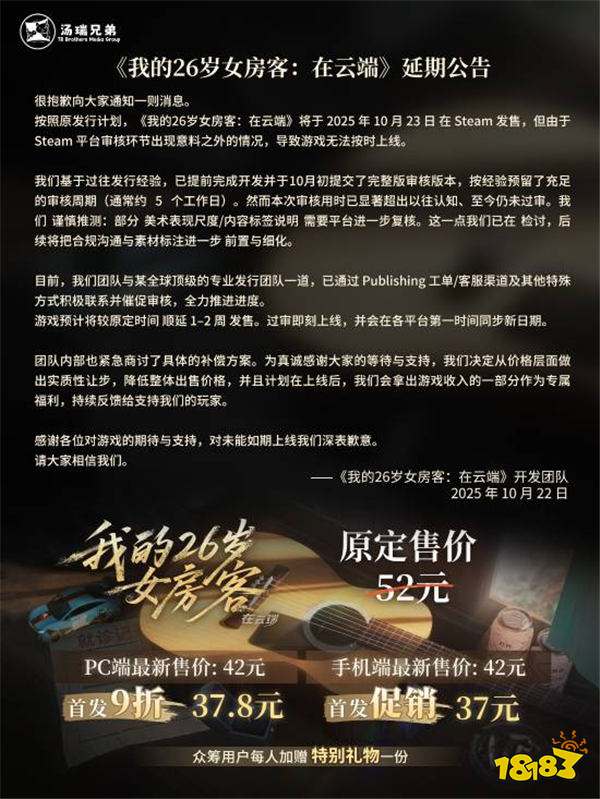 期待已久的国产恋爱视觉小说《我的 26 岁女房客:在云端》,让玩家们先经历了 “空欢喜”—— 原定于 10 月 23 日的上线计划突然告吹,可没等失落蔓延,官方的补偿操作直接暖到了心坎里:不仅把原价 52 元的游戏永久降到 42 元,首发还叠 9 折优惠,37.8 元就能解锁这场 “补青春遗憾” 的旅程,网友直呼 “这诚意,多等几天也值了!”