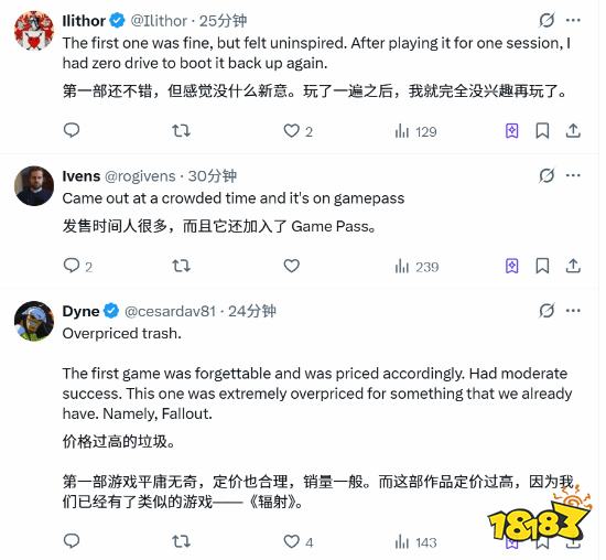 此外,游戏定价与内容价值也成为玩家讨论焦点。有海外网友直言初代“缺乏灵感,通关后无重复游玩动力”,也有人认为本作定价过高,内容体验与《辐射》系列相近但性价比不足。同时,发售档期竞争激烈,多款大作同期上线,也可能影响了其首发热度。