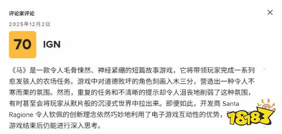 目前,《Horses》在 Metacritic 上已收录8家媒体评测,均分75分。其中 Eurogamer 打出80分,评价道:“Santa Ragione 带来了一款颠覆性的、时而令人震惊、时而诙谐有趣的第一人称叙事恐怖游戏。虽然内容可能略显单薄,但它以一种引人入胜且打破常规的方式,探讨了一些颇具时效性的主题。”