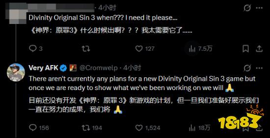 随后,有粉丝在评论区直接追问《神界:原罪3》的消息,Douse明确回复:“目前我们还没有开发《神界:原罪3》的计划,但一旦我们准备好展示正在研发的内容,我们就会公布的。”