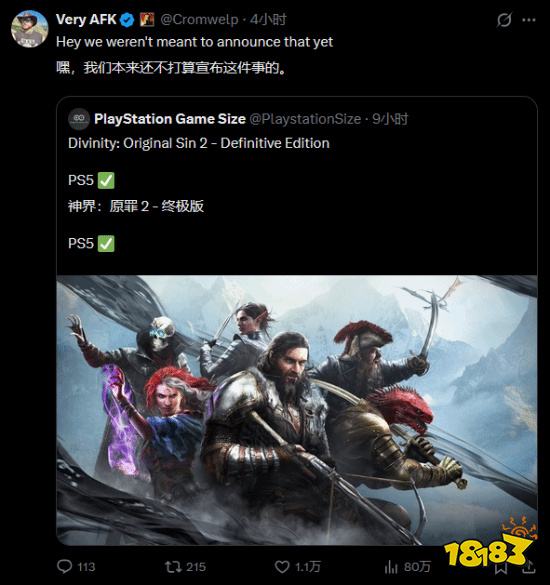 转折发生在昨晚。专注PS游戏资讯的博主@PlaystationSize 透露,他已确认《神界:原罪2 终极版》将获得PS5原生支持(此前仅能向下兼容)。这条消息很快被拉瑞安发行总监Michael Douse(账号Cromwelp)转发,并附言:“我们本来还不打算公布这个的。”——相当于间接确认了消息的真实性。