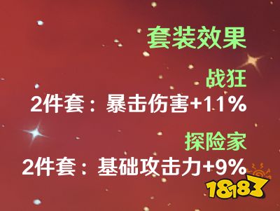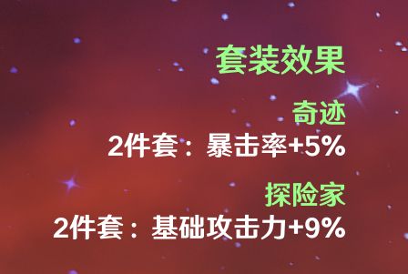 我们可以看到,4件套的探险家套装只比2件套多了4%的收益,这都不需要计算就可以知道是明显不划算的,因此我个人是比较推崇2+2+1的模式