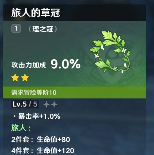 旅人的草冠:跟沙漏一样的效果,直接就是9%的加成,性价比同样爆炸,区别在于装备的位置不同,像是这样的装备还有不少,我只是举例告诉大家,方便大家有个参考和对照。