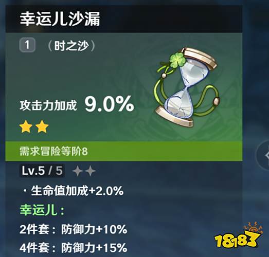 幸运儿沙漏:前期较为容易获得的装备了,稍微养一下就是9%的攻击加成了,你想想套装2件也就是9%而已,所以这件装备确实很不错的。