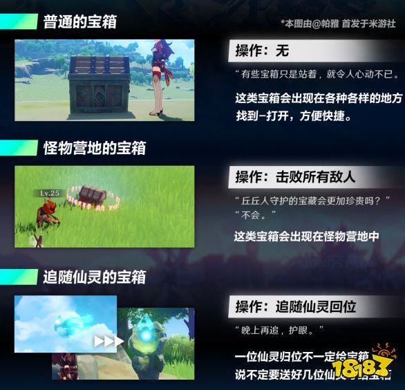 原神大世界中不消耗树脂的玩法的奖励一般体现为宝箱,开启宝箱可以获得一定量的经验。因此,当你清掉了当前所有的任务、刷空了所有的树脂,无事可做的时候,去大世界里探索/解谜/挑战开宝箱拿冒险阅历和素材,顺便再看看风景是个不错的选择。这里为大家准备了一张长长长长长图
