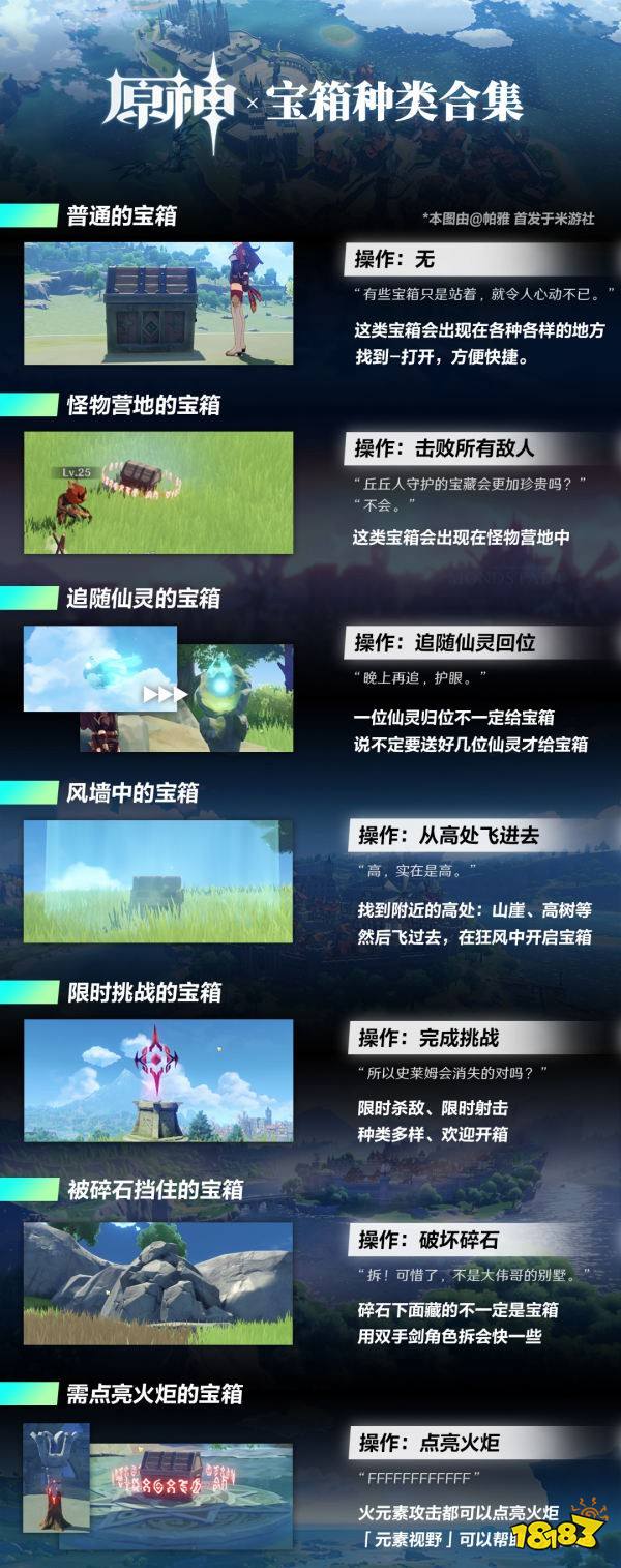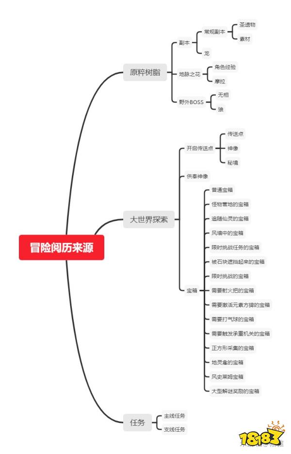 原神大世界中不消耗树脂的玩法的奖励一般体现为宝箱,开启宝箱可以获得一定量的经验。因此,当你清掉了当前所有的任务、刷空了所有的树脂,无事可做的时候,去大世界里探索/解谜/挑战开宝箱拿冒险阅历和素材,顺便再看看风景是个不错的选择。这里为大家准备了一张长图,方便大家保存、查阅和分享。
